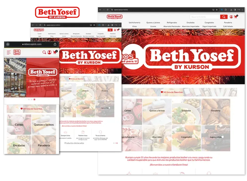Beth Yosef (Kurson Kosher) es referente en México en productos alimentarios kosher, con un amplio catálogo de delicatessen, carnes, panadería y bebidas. Space.bar diseñó y desarrolló la tienda en BigCommerce y las apps nativas (iOS/Android), creando una experiencia de compra adaptada a precios por peso, edición precisa de pedidos y seguimiento en tiempo real.